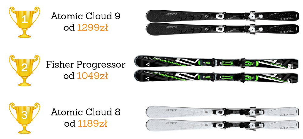 Rolę, jaką podczas wyboru nart odgrywa ich producent podkreśla również ranking bestsellerowych modeli. Na pierwszym i trzecim miejscu podium znalazły się produkty Claoud 9 i Cloud 8 firmy Atomic. Zdobywcą srebrnego medalu zostały narty Progressor, wyprodukowane przez obecną na rynku od 80 lat, austriacką firmę Fisher. Wszyscy trzej liderzy rankingu są modelami wyposażonymi w wiązania, a ich cena waha się od 1049 do 1299 zł. Pokusić się więc można o stwierdzenie, że jeżdżący na nartach Internauci wolą jednorazowo wydać większą kwotę, niż kompletować zestaw narty plus wiązania na własną rękę.